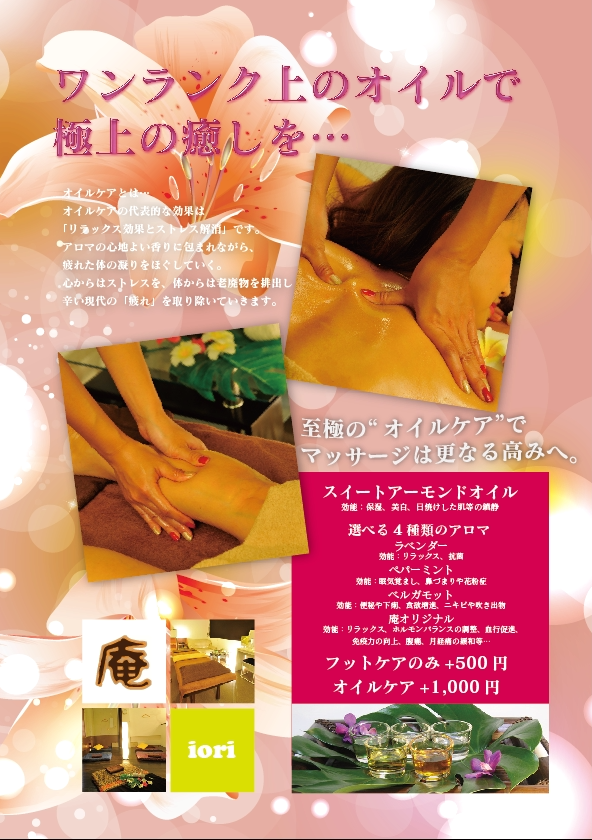 足部按摩計劃第二部分! (^q^) 此前,治療方法僅限於使用藥膏。 現在你也可以選擇你喜歡的油了! 由於它採用有機油脂,對皮膚非常溫和,甚至無需擦拭,而且具有保濕和美白功效! 此外,您還可以從四種香味中選擇一種。 你可以選擇! 它能讓人放鬆,還有美容功效! (^o^) 足部護理需額外收費500日圓。 額外加收1000日元即可享有精油保養服務。 是的,一定會的! 請試試 d=(^o^)=b